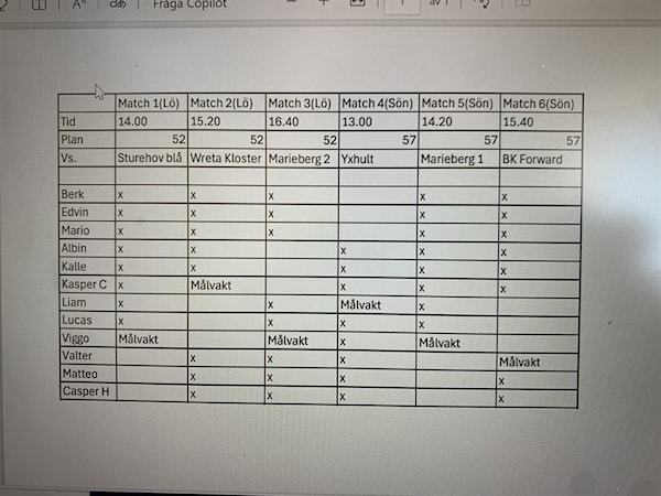 Då det är 12 spelare anmälda så kommer 3 spelare stå över i varje match, här har vi kommit fram till att mest rättvist är att gå på närvaro. Så några står över 2 matcher och resterande står över en match. Jag bifogar Matchschema så kan man planera därefter. Vi ser gärna att alla ändå är på plats alla matcher, speciellt sista då vi delar ut medaljer efter den.