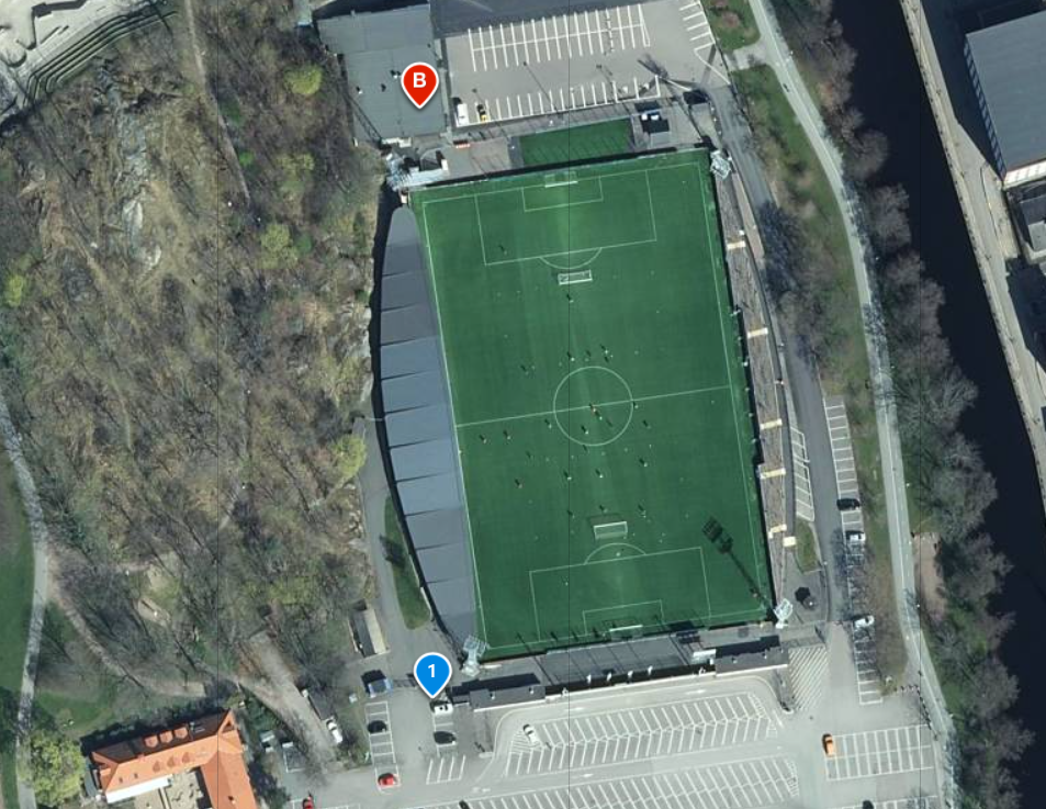 Påminner om föräldramöte på torsdag kl 18 - och det är alltså inte i gula klubbstugan vid Mossen, utan i Mossens lokaler vid Valhalla (se bilden) Om man kommer från sporthallarna, där vi tränar inomhus, går man över Valhallas parkering, in genom en dörr staketet vid (”1” i bilden, knallar vidare över läktaren och ut vid andra kortändan av planen. Där, i det vita huset (”B” i bilden) på andra våningen, har Mossen två rum där vi kan träffas. I måndags hade vi en fin träning på Guldheden, förstärkta med två nya demontränare Kalle (Stella R:s pappa) och Johan (pappa till Svea, bonuspappa till Elsa). Vi är några föräldrar som tror att vi har löst den mest akuta ledarkrisen i laget. MEN försök gärna komma ändå, det vore bra att träffas och prata om hur lagen och träningarna ska funka i år. På onsdag 2 mars tränar vi på Guldheden södra 16.45-18.15. /Ulf