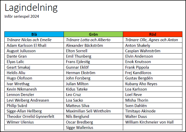 Hej! Här kommer anteckningarna från dagens Föräldramöte. Agenda: Föräldramöte Mossens BK P15, VT2024 Datum: 25 februari 2024 Tid: 11-12 Plats: Lokalerna vid Valhalla IP Deltagare: Tränare: Niclas, Anton och Lotta , Lagförälder: Sofia, Föräldrar: 15 st 1. Seriespel Vi har anmält 3 lag, á 15-16 aktiva till seriespel. Se bild Lagindelning. Barnen delas in i dessa lag (blå, grön, röd väst) även under träning, för att göra lagen mer sammansvetsade, såväl spelmässigt som socialt. Om ditt barn absolut önskar byta grupp, kontakta någon av oss tränare. Då varje lag består av 15-16 aktiva kommer varje barn kallas till match varannan vecka. OBS! Kallelser till match måste besvaras, uteblivet svar tolkas som ett nej-svar. Vi behöver då kalla in en reserv och om barnet sedan dyker upp vid match kommer han inte få spela. Vi är få tränare och tar inte in fler barn i laget nu. Hade vi varit fler tränare hade vi kunnat anmäla fler lag och varje barn fått mer matchtid. Om du är intresserad av att blir tränare, hör av dig, så kan barnen få mer matchtid kommande säsonger! Varje lag (blå, grön, röd) rekommenderas starta en WhatsApp-grupp för samåkningsadministration. Alla uppmanas se över sina kontaktuppgifter på laget.se (lägg in mobilnummer) för detta ändamål. Samåkningsfrågor hanteras av föräldrarna själva, inte tränarna. Spelperiod: v 16-23 samt 34-40. Start 15 april, måndagar kl 18. Zon: Centrum, bestående av följande lag: Azalea BK, Guldhedens IK, Masthuggets BK, Mossens BK Sandarna BK och Ösets BK. 2. Spelform och träningsupplägg Spelformen är 5 mot 5. Inga inkast, straffar eller offside. Inga ”direkta mål” efter fasta situationer. Retreatlinje tillämpas. Länk till spelregler. Vi uppmuntrar aktivt att barnen är aktiva i flera idrotter. Ingen bestraffas med minskad matchtid för utebliven träning – meddela gärna. Alla roterar på anfallare och back, men det är fritt val om man vill spela målvakt vid match. Vid match har vi optimalt två avbytare, och roterar 3 på anfall och 3 på försvar. Man spelar då på samma position hela matchen, men olika position olika matcher. Vi spelar defensivt, med en back alltid kvar mellan vårt mål och motståndarlagets anfallare. Vi återkommer kring framtida träningstider, men vårt önskemål är att få behålla träningstiderna tisdagar kl 17 och lördagar kl 09. Inomhusträningen på lördagar fortsätter mars månad ut. Vårt träningsupplägg följer SvFF, och fokus nu är ”utmana, finta, dribbla, bryta”. Vi låter barnen öva sig att fatta egna beslut och att fokusera nästa aktion, inte bryta ihop vid missar. Särskilda målvaktsträningar planeras. 3. Föräldrars ansvar vid träning och match Svara på kallelser och kom i tid! Vid träning: Hjälp till med att hämta och sätta ihop mål. Föräldrarna ska hålla sig nere vid staketet vid träning, inte följa barnen och ge instruktioner. Det går självklart bra att heja och uppmuntra! Om barnet kommer själv till träningen ligger ansvaret för barnet fortfarande på förälder. Vid match: Lämna barnen hos tränarna vid samling och coachning inför match. Stanna inte kvar precis intill, eftersom barnen har svårt att fokusera och ta coachning då. Föräldrar ska stå på den ena sidan och tränare och avbytare på den andra sidan under match. Kommentarer och förslag från föräldrar under mötet: Det är viktigt att tränarna är aktiva så att barnen får coachning. Låt barnen samla in/lämna in västar, konor, bollar etc innan avsked, för bättre ordning vid återlämning. Köp gärna in västar i lämplig storlek och lagens färger! Finns fler synpunkter eller önskemål kring hur tränarna kan agera, såväl gentemot enskilt barn eller gruppen, var tydliga med detta, så kan vi anpassa oss. 4. Andra aktiviteter Andra aktiviteter med laget, t ex korvgrillning, laserdome etc planerar vi gärna in. Det finns medel i lagkassan. Intresseanmälan att vara matchknattar, maskotar, bänkvärmare och halsduksbärare till GAIS och IFK Göteborg har skickats in, och vi håller tummarna för att laget får möjlighet att delta som detta under året. Har ni fler aktivitetsförslag, hör av er! 5. Info från lagföräldrarna I föreningsliv är det viktigt att alla engagerar sig, inte bara tränarna. För att hålla avgifterna nere och få in intäkter till Lagkassan att nyttja till cuper, aktiviteter etc, behöver alla föräldrar engagera sig och utföra vissa uppgifter, t ex städning av klubbstugan, sälja Bingolotter vid jul mm. För att få in pengar kommer vi anmäla intresse att hålla i de två sammandragen i Mossens regi (se nedan), vilket innebär bygga sarger, sälja fika etc. Ett rullande schema kommer sättas upp, så att alla tilldelas uppgifter. Kan man inte tilldelad uppgift ansvarar man för att byta med annan förälder. • 23 mars kl 10-13, Kick off • 21 april, Mossens Sammandrag 1 • under vecka 26, Städdag • 21 september. Mossens Sammandrag 2. 6. laget.se och WhatsApp Se över dina kontaktuppgifter på laget.se – lägg in mobilnummer för att kunna bjudas in till WhatsApp-grupp. Komplettera gärna barnets profil med bild för att underlätta namninlärning. Ha det gott! Tränarna: Länk till spelregler: https://aktiva.svenskfotboll.se/492035/globalassets/svff/dokumentdokumentblock/tavling/stadgar--reglementen/spelregler-barn-och-ungdomsfotboll.pdf