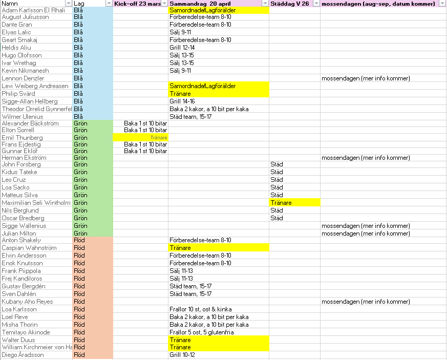 Hej! Som vi pratade om på föräldramötet så har vi nu satt ihop ett rullande schema utifrån de event som sker framöver, vad vi känner till i dagsläget. 23/3 är det Mossens kick off och då ansvarar 4 föräldrar ut lag grön för att baka ett bakverk var à 10 bitar (går utmärkt att köpa om man inte har lust att baka😊). Tänk på nötförbud! Vilka som har tilldelats denna uppgift ser ni i bifogat excelark. Bakverken ska lämnas kl 10.00 i klubbstugan den 23:e. Några andra föräldrar ur lag grön ansvarar för städning av klubbstugan v 26. 20/4 kommer vi ansvara för vårt första sammandrag! Det kommer ge ett bra bidrag till lagkassan för kommande cuper som våra barn kan få delta i. Detta sammandrag ansvarar större delen av föräldrarna i lag blå och röd för. Vilka uppgifter vi satt er på finns också i excelarket. Resterande föräldrar ansvarar för Mossendagen som går av stapeln i slutet av augusti. Datum kommer längre fram. Kan man inte det datum som man tilldelats , är det ens eget ansvar att byta med någon annan. Meddela gärna oss om ni byter så vi vet att allt flyter på.