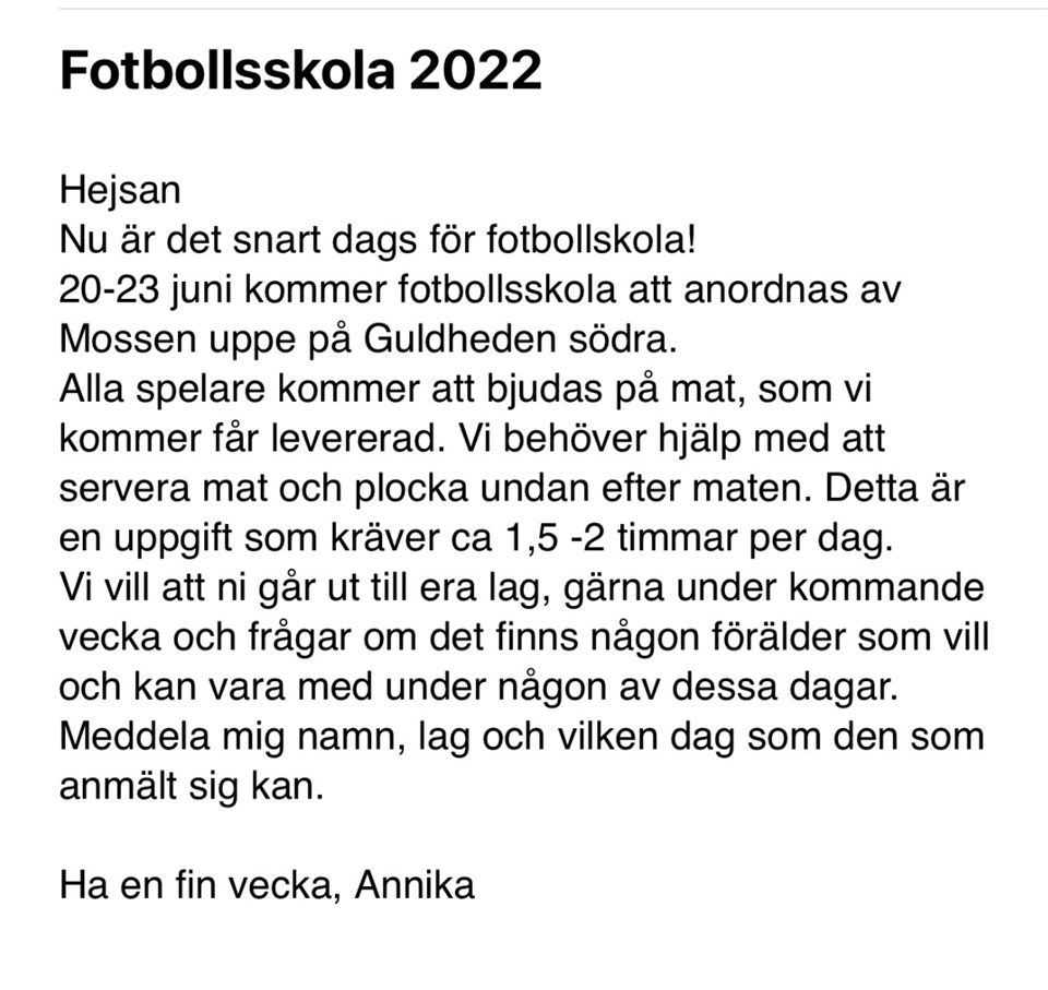 Hej alla. Fotbollsskolan den 20-23 juni behöver lite hjälp från frivilliga som kan. Läs mer nedan. Om ni kan skriv gärna i flödet. Ha det fint