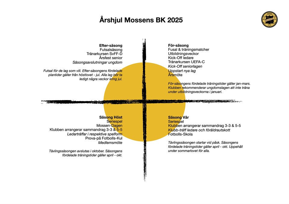 Mossens styrelse presenterade på Medlemsmötet den 15/10 en översiktlig bild över "vad är det vi gör". Ett årshjul för ledare, föräldrar och spelare.