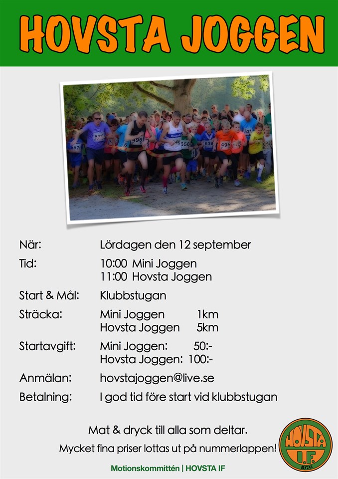 Nu är det mindre än 2 veckor kvar till Hovsta Joggen. Så passa på att anmäla er till Hovsta Joggen lördagen den 12 september. Anmälan gör ni till hovstajoggen@live.se där ni uppger namn och om ni vill springa 5km eller 1km. Det går bra att anmäla sig på plats men för att planera inköp av mat så ser vi gärna at ni föranmäler er. Start tider 10:00 Mini Joggen 1km 11:00 Hovsta Joggen 5km Pengarna vi får in under detta evenemang går oavkortat till att utveckla och underhålla utegym, motionsspår, grillplats, områden runt våra fotbollsplaner och klubbstuga mm. Man behöver inte springa utan det går utmärkt att gå sträckan. När alla är i mål så genomför vi utlottningen av massor av fina priser där alla har lika stor chans att vinna. Så ta med släkt, vänner, grannar, arbetskamrater och delta i detta lopp som börjar bli en tradition. Ju fler vi blir desto roligare. Gör en kul aktivitet med ert fotbollslag, innebandylag eller gymnastikgrupp. Vi räknar naturligtvis med att få se hela föreningsstyrelsen på startlinjen i år! Välkomna! /Motionskommittén