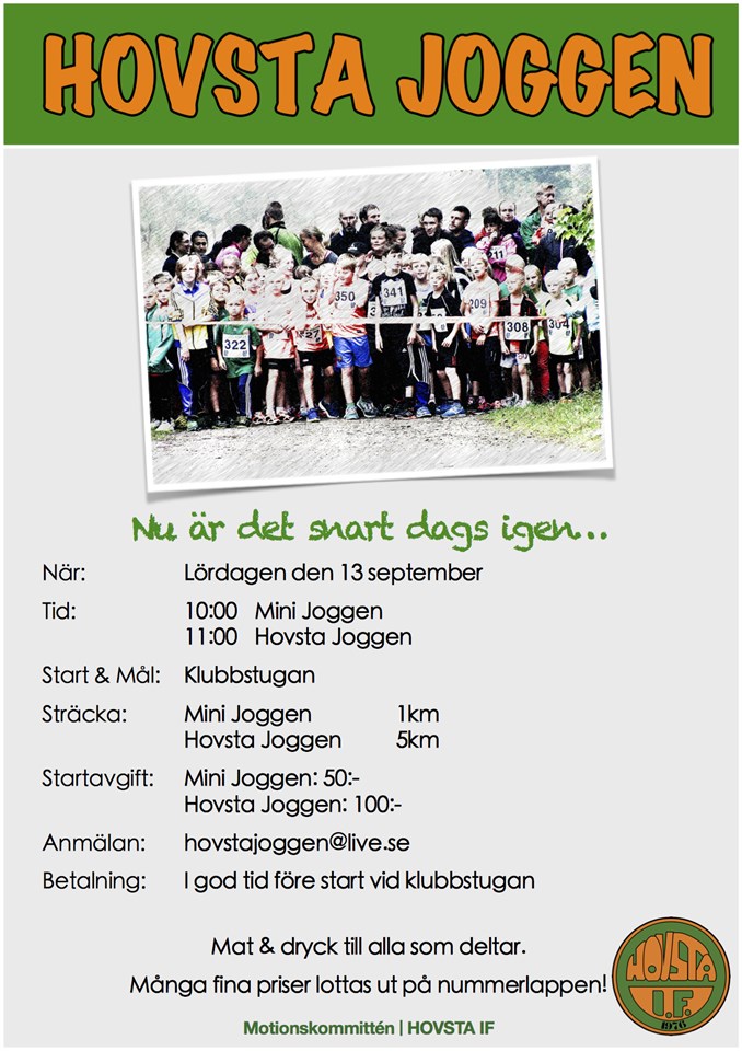 Det börjar närma sig den andra lördagen i september, vilket betyder att det är dags för årets upplaga av Hovsta Joggen. Lördagen den 13 september går startskottet. Klockan 10:00 är det Mini Joggen för de minsta, de springer ca 1 km. Klockan 11:00 startar Hovsta Joggen som är en sträcka på 5 km. Loppets sträckning går genom Hovsta. Start och mål är som vanligt vid klubbstugan. Efter målgång bjuds det på hamburgare och dryck. I Hovsta Joggen har vi fyra klasser. Herr, Dam, Pojk (födda 1999 och yngre) och Flick (födda 1999 och yngre). Pris till segraren i respektive klass samt ett dignande prisbord där priserna lottas ut på startnumret. Kostnaden är 50:-/deltagare i Mini Joggen och 100:-/deltagare i Hovsta Joggen. Anmälan görs på hovstajoggen@live.se och betalning görs på plats på tävlingsdagen. Det går bra att anmäla sig på plats men vi önskar att så många som möjligt föranmäler sig så att vi kan beräkna åtgången av mat och dryck. Kom i god tid innan start, uppvärmningen kör igång en kvart före start. Passa på att anmäl hela fotbolls- eller innebandy-laget och utmana varandra. Eller varför inte en trevlig aktivitet med jobbarkompisarna eller grannen. Varmt välkomna! Motionskommittén