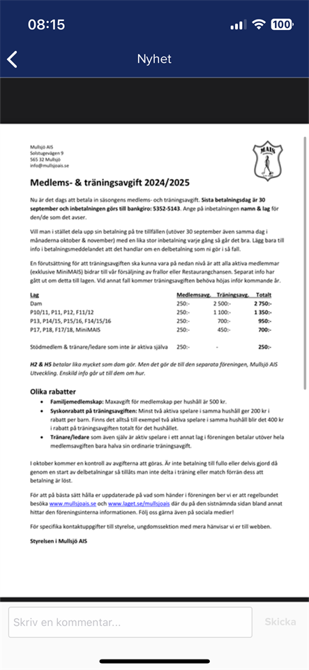 Här kommer information om medlems/träningsavgiften. P Blå (15/16) 21 sep 2024 0kommentarer