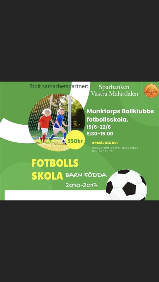 Munktorps BK anordnar fotbollsskola för barn födda 2010-2017. Måndag till torsdag 9:30-15:00. Kostnad 550kr - då ingår mat, mellanmål, vattenflaska och fotboll. Anmälan på mejl till magdalena.jogevall@koping.se - i anmälan vill vi ha kontaktuppgifter (telefon/mejl), födelseår samt allergier. Info delas även på sociala medier. V h Linda PF 11-12 26 maj 2023 0kommentarer