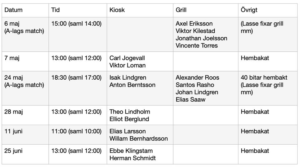 På bilden ser ni kioskschemat för P05/06/07 Vid förhinder fixar man själv en avbytare. I kiosken finns det kaffe, godis, ”gofika”, läsk, festis och glass. Vi erbjuder även ngt hembakat alternativ som ansvariga tar med sig. Det går att betala med swish och kontanter. Vid frågor - ring Magdalena Jogevall 070-677 45 79 P-05/06/07 4 maj 2023 1kommentar