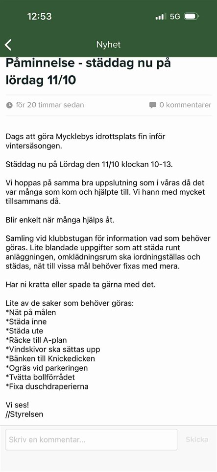 Hej! Ledsna för röran med tiderna på söndag men Spelschemat för söndagen är återigen uppdaterat. Vi spelar första matchen kl 14:30, därför blir det smaling för ombyte i Mycklebystugan kl 13:10. Vi behöver alla spelare på plats då. Sista matchen börjar kl 17:10. Vi åker därefter och käkar ihop för dem som vill och kan. //Ledarna F-14/15 10 okt 2025 0kommentarer