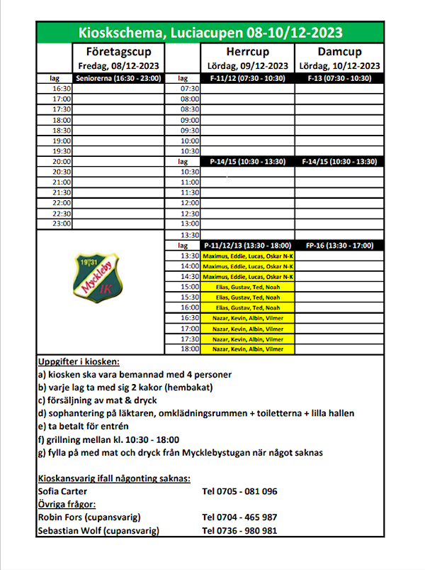 Vårt lag behöver bemanna kiosken med 4 personer på lördag, 9/12 mellan kl. 13.30 - 18.00. (sluttiden beror lite på hur många herrlag som anmälar sig sista 2 veckorna.) I bilaga finner ni förinfyllda namn på er som ska stå i kiosken på angiven tid. Byt gärna emallan ifall tiden inte fungerar för er. Vi ser gärna att killarna hjälper till med lite stöttning av föräldrarna vid behov. På schemat står uppgifterna som behöver utföras under tiden man står i kiosken. Prata ihop er vem som kan bidra med hembakt (2-3 kåkor för oss som lag). Vi tar så klart emot kakor av dem som inte står i kiosken. Ju fler som engagerar sig ju enklare blir det.