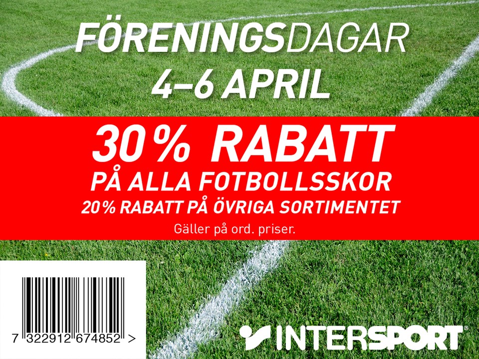 Tillsammans med Intersport bjuder vi in dig till föreningsdagar 4-6 april. Få 30% rabatt på alla fotbollsskor och 20% rabatt på övriga sortimentet till ord.pris. Ett perfekt tillfälle att köpa skor, kläder och utrustning till specialpris! Visa upp denna inbjudan i kassan för att få rabatten. Välkommen!