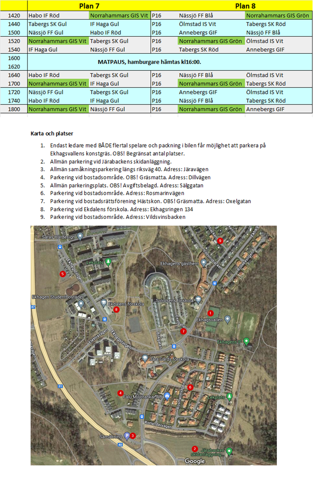 Hej, Hoppas killarna är lika laddade inför morgondagen som vi ledare! Vi träffas kl.13.00 på NGIS, kom ombytta till samlingen. För de som använde egna strumpor eller shorts i onsdags så finns det extra på plats. Det kommer bli varmt imorgon, se till att barnen dricker mycket idag men även mellan matcherna imorgon och ta gärna med mellanmål så killarna orkar med hela dagen. Vi har samma lagindelning som i onsdags: LAG VIT (JOEL OCH JESPER) spelar sina matcher på plan 7 LAG GRÖN (FREDRIK OCH BILAL) spelar sina matcher på plan 8 Parkeringsinfo: Under Eko-cup kommer parkeringsplatserna vid fotbollsplanerna vid Ekhagsvallen att vara avstängda. Vi hänvisar därför till markerade områden på kartan för en smidigare upplevelse och för barnens säkerhet. Det kommer att vara skyltat med parkeringsplatser och Ekhagens IF kommer även ha parkeringsfunktionärer att hjälpa till på flertalet markerade platser under cupens gång. Vi rekommenderar att ni väljer att svänga av mot Nässjövägen ut ur Ekhagsrondellen för att sedan ta avfarten mot Järabacken i första hand då Ekhagsringen fort gärna blir full. Vi uppmanar att både ledare med spelare och närstående väljer att samåka till högsta möjliga mån. Se bild för spelschema och parkeringskarta, mer info finns på denna länk: INFO Parkering Vi ses imorgon! Hälsningar Ledarna