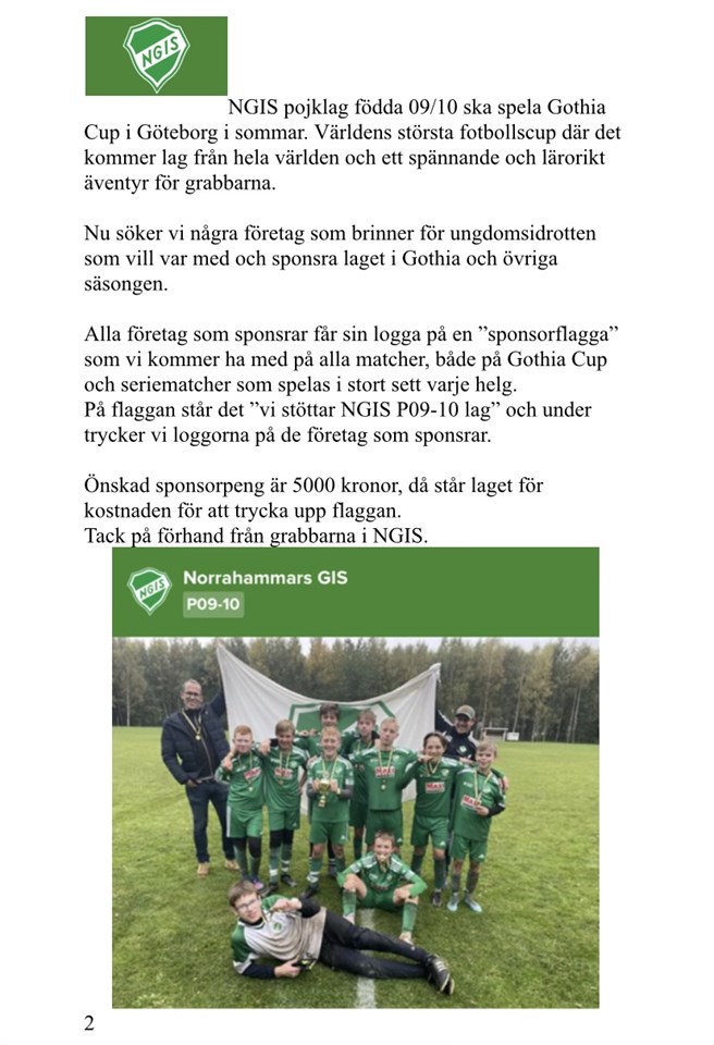 Hej, Nu har Mattias och Sabine satt ihop ett fint flygblad att dela ut till företag. Jag har lagt upp dokumentet som en pdf på den här sidan under /dokument/. Så det är bara att ragga på hos era kontakter. Mattias förslag är även att 4-6 killar knackar dörr hos de lokala företagen. Mattias kan gå med och hjälpa dem. Vad säger ni om detta? P09-10 24 apr 2023 6kommentarer