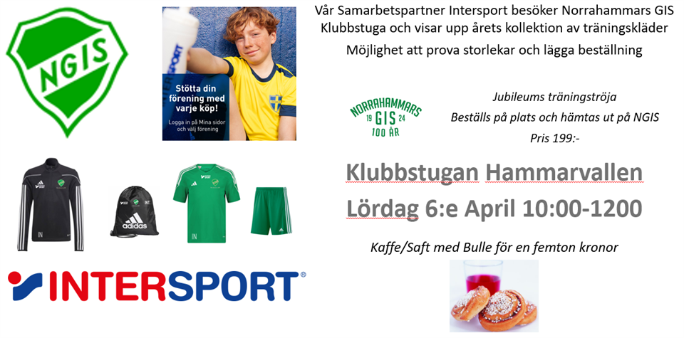 Hej Lördag 6:e April kommer vår samarbetspartner Intersport till Klubbstugan 10:00-12:00. Intersport har med sig provkläder för årets föreningssortiment. Finns möjlighet att prova kläderna och lägga beställning i föreningsdelen på Intersport. Kommer finnas servering av kaffe/saft med Bulle för 15kr. Matchkläder för seriespelande lag: Finns möjlighet att byta matchkläder om annan storlek behövs alternativt få låna matchställ om erat barn inte fått ett tidigare, ta med matchkläder som ni har så byter vi mot annan storlek. Jubileums funktionströja: Funktionströja som är en bra träningströja eller att ha på sig till vardags, finns att prova och beställa av NGIS. Är i svart utförande med grönt tryck på bröstet. Kostnad 199:-, beställs via NGIS och hämtas och betalas på NGIS vid leverans. Tröjan trycks av vår samarbetspartner Intersport. Varmt välkomna Mvh Jonas Norrahammars GIS Patrik Intersport P11 16 mar 2024 0kommentarer