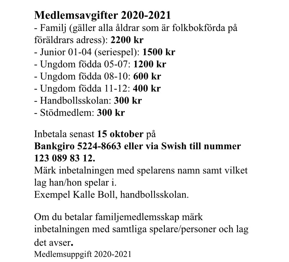 Hej. Vill bara skicka en pÄminnelse om medlemsavgift för ni som inte betalt in. Info se bild MÄ sÄ gott sÄ ses vi söndag 16-17 Handbollsskolan 17 okt 2020 0kommentarer
