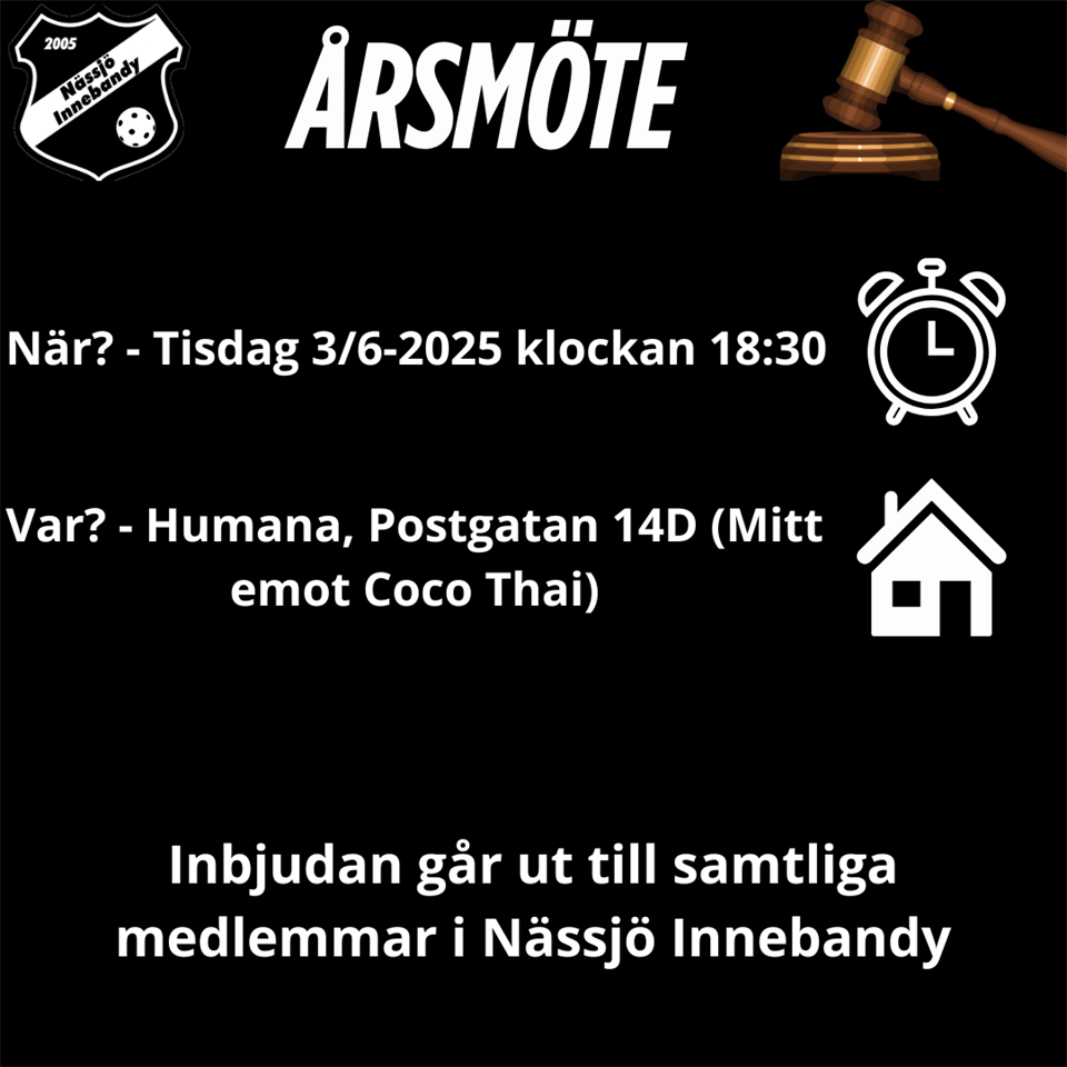 Tisdagen den 3/6 klockan 18:30 är det dags för årsmöte. Nässjö Innebandyförening bjuder härmed in samtliga medlemmar att medverka. Mötet äger rum i Humanas lokaler på Postgatan 14D i Nässjö (Mitt emot Coco-Thai).
