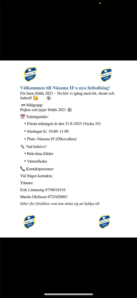 Klicka på bekräftelselänken i det mejl vi skickat dig för att börja ta emot uppdateringar från Näsums IF PF-21.