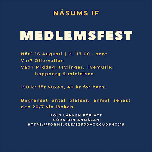 Minst en i hushållet behöver vara medlem i Näsums IF. Anmälningsavgiften är 150 kr för vuxen och 40 kr för barn under 14 år. För vuxna och barn över 14 år serveras det grillad karré och potatissallad med tillbehör. Till barn under 14 år serveras det hamburgare. Ni medtager egen dricka för kvällen.