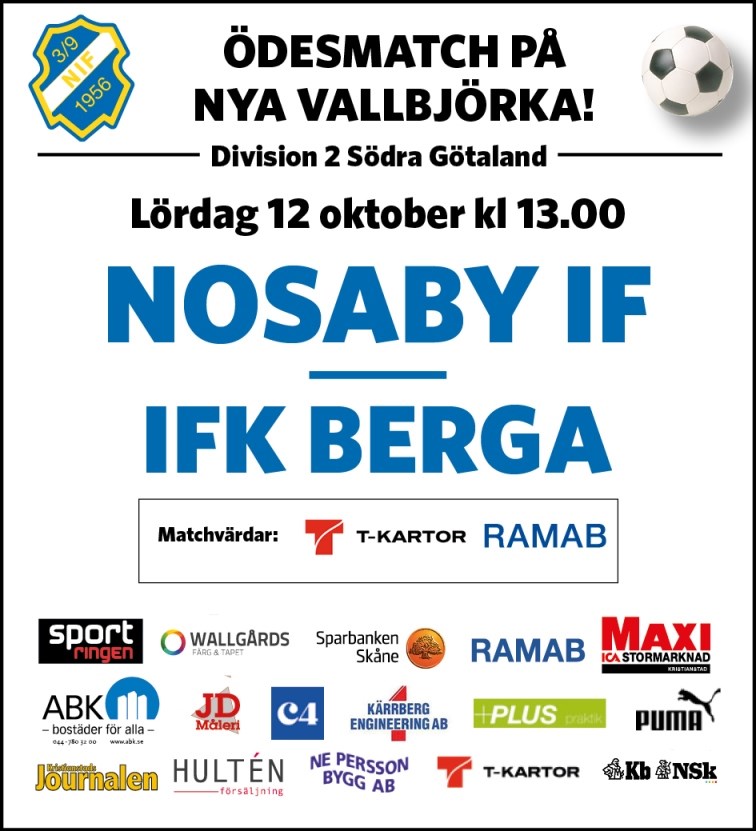 Efter förlusten senast mot Högaborg finns inga livlinor kvar för A-laget om man skall klara Div 2-kontraktet. Det krävs seger mot bottenkonkurrenten IFK Berga (23 p) som ligger på kvalplats en poäng före Nosaby. Förlust innebär degradering. I teorin kan även oavgjort räcka för att ha chansen men då krävs seger mot KFC i sista omgången och övriga resultat går rätt. Det kommer bli precis som ifjol en spännande avslutning på serien. Vi hoppas på samma upplösning. Nosaby klarade sig kvar på matchens sista spark och att just Berga slog Österlen. I år ser det tuffare ut men det kan gå. Kval är nog det bästa Nosaby kan hoppas på. Många av bottenkonkurrenterna möts slutomgångarna. I denna omgången möts IFK Hässleholm och IFK Simrishamn (båda 26 p) där förlorande lag dras in i den absoluta bottenstriden. I sista omgången möts Lödde (21 p) och IFK Berga. För Nosabys del gäller det troligen att man behöver vinna både mot Berga o KFC. Inför lördagens match hoppas vi att merparten av de spelare som saknades senast mot Högaborg är tillbaka i truppen. Ameer är varningsavstängd och Mike Andrew fick en match till efter sitt röda mot IFK Hässleholm. IFK Berga som var tippade topplag har haft en tung säsong främst på bortaplan. Laget är mycket starkt framåt med lagets skyttekung Peiman Elyassi och rutinerade Papa Diouf. Det brukar bli fysiska matcher när lagen möts och det gäller att Nosaby står upp i duellspelet. Vi hoppas att alla nosabysupportrar kommer till Nya Vallbjörka och stödjer laget på lördag och ger killarna energi att ta 3 poäng. Avspark 12 okt kl 13.00 Mycket välkommen! A-Lag 10 okt 2024