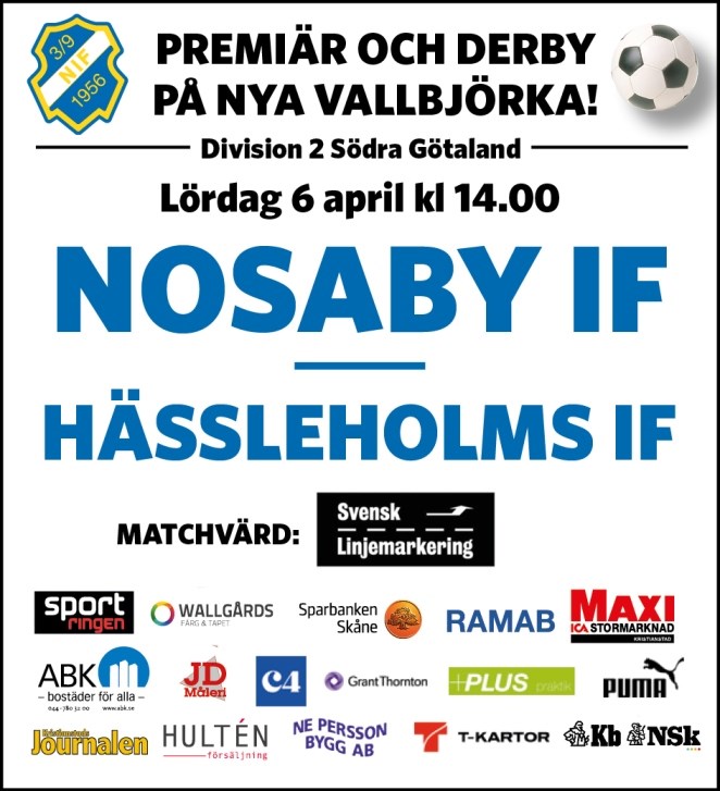 Imorgon är det dags för ett hett derby mot förväntade topplaget Hässleholms IF. Det fanns en viss osäkerhet om matchen skulle kunna spelas på Nya Vallbjörka efter allt regn och kyla men vaktmästarteamet har gjort ett fantastiskt jobb. Nu hoppas vi att väderprognoserna håller och värmen kommer så hela vår verksamhet kan flytta till Vallbjörka kommande vecka. Nosaby har byggt nytt inför säsongen med nya tränare och nästan ett helt nytt lag. Försäsongen var trevande utan segrar och inför seriepremiären mot Österlen var det inte många som trodde på poäng men Nosaby klarade 1-1 efter samma siffror i paus. Resultatet var rättvist och defensivt var det stabilt. Det som framförallt som kan förbättras är sista tredjedelen. Dock kommer det säkert bli bättre när laget blir mer samspelt och passningarna sitter. Det bjöds på många skrällar i seriens första omgång bl a att nykomlingen IF Lödde tog poäng mot HIF som slutade 0-0. Vi hoppas Nosaby kan ta revansch på förra årets svidande 0-4-förlust på Nya Vallbjörka. Om Du inte kan vara på plats så sänder Kristianstadbladet matchen på sin websida.och i appen Min Fotboll målrapporteras matchen. Avspark kl 14.00 på Nya Vallbjörka Mycket Välkommen A-Lag 5 apr 2024