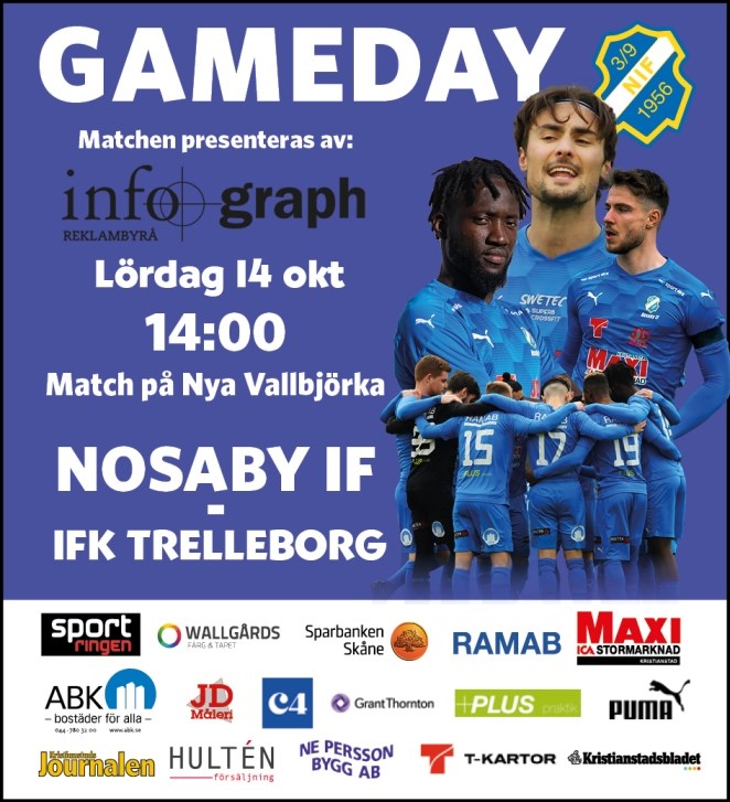 Nosaby tog en viktig poäng (3-3) borta mot Balkan i senaste omgången. Nosaby hade ledningen 3 gånger men kunde tyvärr inte knyta ihop säcken och ligger kvar på negativ kvalplats. Poängen innebär att Nosaby kan säkra minst kvalplatsen på lördag vid vinst och kan klara sig utan kval om man kan ta in de 2 poäng Österlen ligger före på säker mark. Lördagens motståndare IFK Trelleborg säkrade kontraktet trots att Österlen kvitterade 90+5 men en poäng var det som behövdes för IFK. Nosaby kan visserligen komma upp på samma poäng med två vinster men Trelleborg har överlägsen målskillnad. Inför lördagens match har Nosaby alla tillgängliga förutom Tristan Hedman som är avstängd. Teddy och Astrit är tillbaka efter sina avstängningar. En joker kan Madueke Stephen bli som kom från Asarum inför säsongen men hann bara göra försäsongen innan han fick lämna Sverige. Nu har de byråkratiska kvarnarna malt klart och han kan börja på sitt jobb som han hade fått. I kväll gjorde Stephen första träningspasset på Nya Vallbjörka och det är troligt att han är med truppen på lördag och kan bli viktig kugge om det blir kval. Stephen har tillhört de bästa mittfältarna senaste åren i Div 2. IFK Trelleborg som är nykomling har gjort en bra säsong även om man tappat under hösten. Lagets store målskytt som Nosabyförsvaret måste hålla koll på är Ilir Tahiri som ligger 5:a i seriens skytteliga på 14 mål. Vårens möte på Vångavallen slutade 0-0. Avspark kl 14.00 på Nya Vallbjörka Mycket välkomna! A-Lag 12 okt 2023