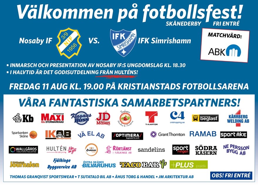 Den 11 augusti intar Nosaby IF Kristianstads Fotbollsarena när Nosaby IF möter IFK Simrishamn i ett hett Skånederby i Div 2 Södra. Båda lagen behöver poäng i kampen om att stanna kvar i serien. Våra fantastiska samarbetspartners gör det möjligt att vi kan bjuda på Fri Entré. Vi hoppas på stort publikstöd och att Nosaby ska vända sin negativa trend med 3 raka förluster. I och med alla lag i bottenstriden tog poäng i förra omgången behöver verkligen Nosaby en seger. Det gäller att laget bryter sin måltorka efter laget gått mållösa i de 2 inledande höstmatcherna. Senast mot topplaget Hässleholms IF var spelmässigt ett fall framåt trots förlusten. I fredagens match är Armin Aganovic varningsavstängd. IFK Simrishamn är nykomling i serien som gjort det bra. Framförallt är laget mycket starkt hemma vilket Nosaby fick erfara i vårmatchen som IFK vann med klara 3-0. Laget har 2 vassa avslutare i Pontus Wiktorsson och Ludwig Lloyd. Under transferförnstret har italienaren Francesco Corriale från Bastia Calcio 1924.och Linné Björk från Lunds BK anslutit. En halvtimme innan avspark kl 18.30 kommer våra ungdomslag tåga in och presenteras så kom i tid! Om Du inte kan se matchen live så sänder Bladet den på sin hemsida. Mycket välkommen A-Lag 9 aug 2023
