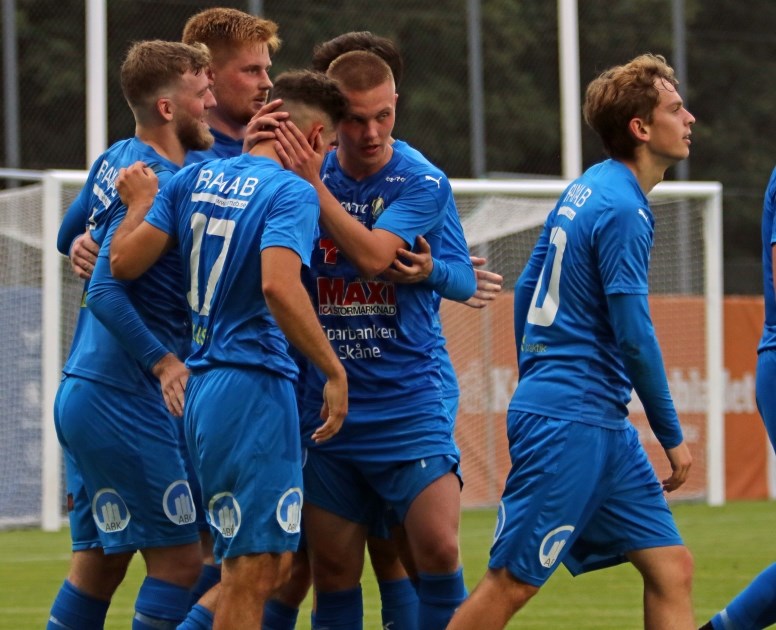Efter 6 matcher utan seger bröt Nosaby trenden ikväll genom en 2-0-seger mot IFK Simrishamn efter 1-0 i paus på Kristianstads Fotbollsarena. Det blev en succédebut för nyförvärvet Teddy Bergqvist som stängde matchen med sitt mål i 86:e min på sin gamla hemmaarena. Målet utlöste ett stort jubel bland de nästan 900 i publiken varav en stor del var Nosabys ungdomsspelare som presenterades innan matchen. Första halvlek var jämn. Närmast i inledningen var Astrit Mehmeti som löpte ifrån sin bevakning men skottet gick utanför. IFK var farliga på fasta situationer och skapade många hörnor. Astrit fick revansch i 40:e min när Philip Perssons långboll skar genom simrishamnsförsvaret och han tog emot den och kallt lobbade bollen över målvakten till 1-0. Kort efter var det nära igen när Teddys lobb nickräddades av utrusande målvakten och bollen gick i en båge mot målet och studsade i upp i ribban. På returen var Lassiné först men nicken täcktes ut till hörna och 1-0 höll sig till paus. I andra gick Simrishamn på kvitteringsjakt och hade ett par riktigt heta chanser men Leo i målet storspelade. Ameer som vikarierade för Armin som mittback var oerhört stabil och fick helt välförtjänt pris som bästa spelare i Nosaby. IFK fortsatte trycka på och deras vasse anfallare Pontus Viktorsson ställde till problem för nosabyförsvaret. Nosaby hade några bra omställningslägen men det dröjde till 86:e innan 2-0 kom. Bollen spelades ut till Emil på vänsterkanten som gick runt sin back och spelade snett inåt bakåt till Teddy som mötte bollen direkt men skottet gick rakt på målvakten. På returen kom inte målvakt och försvarare överens och Teddy snappade upp bollen och kunde enkelt rulla in bollen till 2-0 och stänga matchen. Bortalaget hade ett par reduceringschanser på övertiden men 2-0-stod sig och värmande applåder och jubel kom från publiken när slutsignalen gick. Segern var välbehövlig i bottenstriden efter att alla lagen under Nosaby tog poäng i förra omgången. Positivt är att laget höll nollan samt bröt måltorkan.. I nästa omgång väntar en tuff bortamatch på Västra Hed i Karlskrona mot FK Karlskrona. Avspark 19 augusti kl 13.00. A-Lag 11 aug 2023