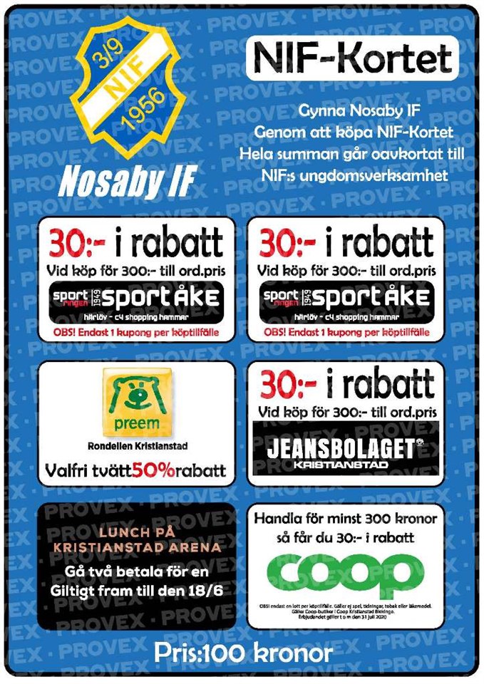 I dessa Coronatider är det tufft för alla föreningar. Nosaby IF är inget undantag trots en ekonomi i balans så påverkar inställda träningar, seriematcher, minskade sponsorintäkter och pausad grillning på EKO föreningen negativt. För att stärka ekonomin har vi tagit fram ett Nosabykort i samarbete med våra sponsorer. Förutom föreningar drabbas också den lokala handeln hårt. Genom att köpa Nosabykortet kan Du både stötta Nosaby IF och företagen på kortet. Erbjudanden är mycket förmånliga och täcker mer än väl de 100:- som kortet kostar t ex ta chansen och bjud en vän eller kolllega på lunch på Arenarestaurangen och gör bilen vårfin på Preem Rondellen som erbjuder valfri biltvätt till halva priset m m. NosabyKortet kostar 100:- och giltighetstiden är t o m 31 juli förutom Arenarestaurangen som stänger för sommaren 18 juni. Hela intäkten tillfaller Nosaby IF och för varje Nosabykort som respektive ungdomslag säljer går 34 kr till lagkassan. Provisionen skall användas för gemensamma aktiviteter som t ex cuper avslutningar m m. Korten kan köpas antigen via respektive lag eller via epost till vårt kansli nosabyif@live.se. Nosaby IF 16 maj 2020