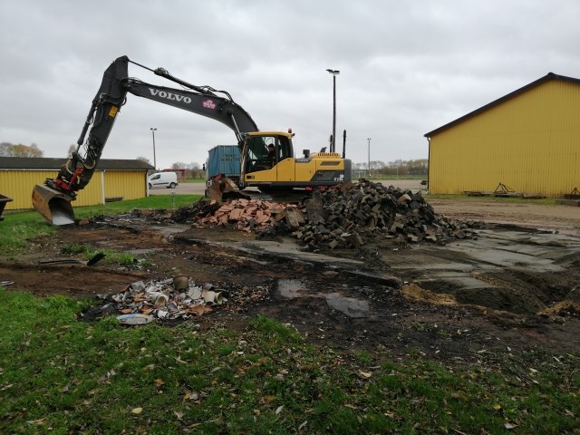 Nu är äntligen resterna av vårt garage/maskinhall rivet. Det har tagit en lång tid men alla tillstånd måste vara plats för att sätta igång. Under veckan räknar vi med att resterna kommer transporteras bort. Vi håller nu på att diskutera med försäkringsbolaget om återuppbyggnaden och målsättningen är att en ny byggnad skall stå klar när nästa vårsäsong startar i april. Vi vill än en gång tacka alla ni som stött oss efter branden på olika sätt. Nosaby IF 27 okt 2019