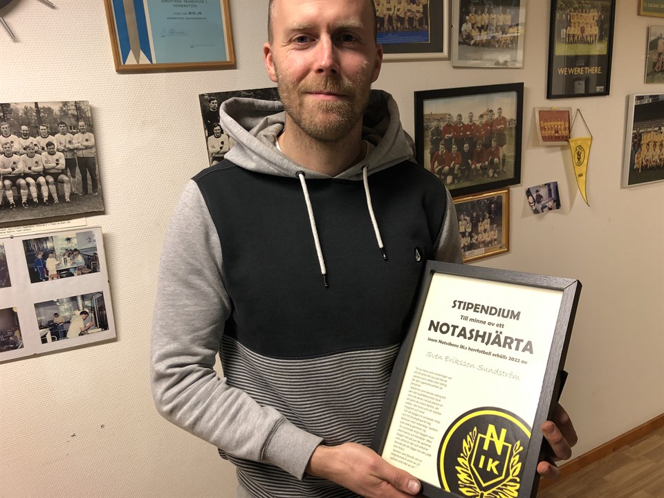 I samband med föreningens höstmöte på måndagskvällen fick Sven Eriksson Sundström det nyinstiftade stipendiet ”Till minne av ett Notashjärta”. Ett stipendium som vill uppmärksamma spelaren som kanske inte får de stora rubrikerna men som alltid är där och ger sitt yttersta för laget och som är viktig för gruppen. Stipendiet tilldelas en herr- och en damspelare och både Sven och damlagets Josefin Kemppainen får anses vara mycket värdiga pristagare.