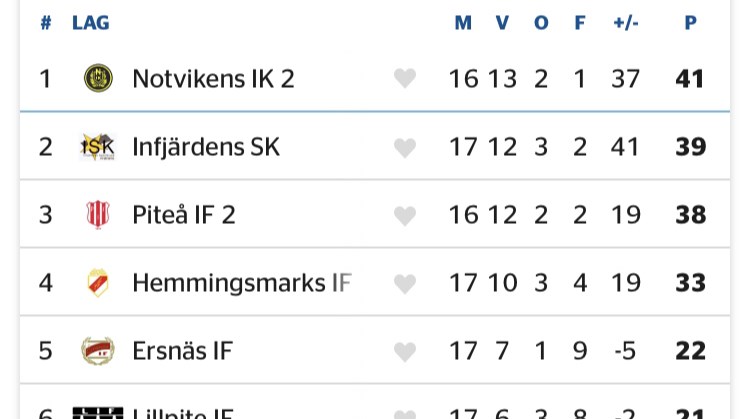 På måndag kväll har Notasherrarnas lag 2 chansen att avgöra södra fyran i den näst sista omgången. Seger borta mot ett formstarkt, piggt och ungdomligt Piteå IF 2 skulle ge en ointaglig ledning inför sista omgången. Årets första möte bjöd en bra div 4-match. Notas kom undan med blotta förskräckelsen när PIF kvitterade till 1-1 och sedan trummade på till sista minuten. NIK har en hårt ansatt trupp och på måndag kommer det en kvartett i bil från Umeå för att stötta upp. Det handlar om Olle R, J Pantzare, Victor P och Felix R. Jacob Engström, tränare: - Väldigt inspirerande uppgift mot ett ungt och spelskickligt Piteå. Sett till tabellen är det en viktig match för båda lagen, men vi är ödmjuka inför uppgiften och kommer fokusera på vår prestation. - Det kommer krävas att vi är tålmodiga i vårt spel och tar jobbet för varandra i 90 minuter plus tillägg. Truppen: Harry K, Axel R, D Öhman, Edwin LJ, V Skogfält, H Berlin, Soheyl M, Nino T, J Sochor, Felix R, Olle R, Viktor P, J Pantzare, Ahmed J Avstängda: Emil L och Bangk K