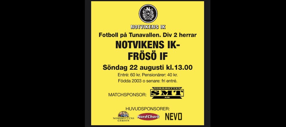 Lite ovanlig matchdag för Notasherrarna. Det är söndag (22/8) kl.13.00 som gäller när Frösö IF gästar Tunavallen. Självklart finns det ett lotteri till matchen som härmed är igång. Lagen har redan hunnit mötas nere i Jämtland. Då vann NIK med 1-0 efter ett nickmål av Jesper Jacobsson. Hur Kan du stötta via lottköp? För varje 20 kr du Swishar erhåller Du en lott. För 100 kr får du sex lotter. För 200 kr får du femton lotter. Swisha till 123 29 44 973. Märk med "Lott 22/8". Lotter kan köpas i samband matchen och med fördel i förväg via nätet. Dragning sker kl.13.45 på söndag 22/8. Lotterivinster 1 st Charklåda från Nordchark (värde ca 700 kr) Sidovinster: Bilvårdsset från OKQ8 Notviken samt Toapappersbal. Vi tackar alla Notashjältar på förhand!