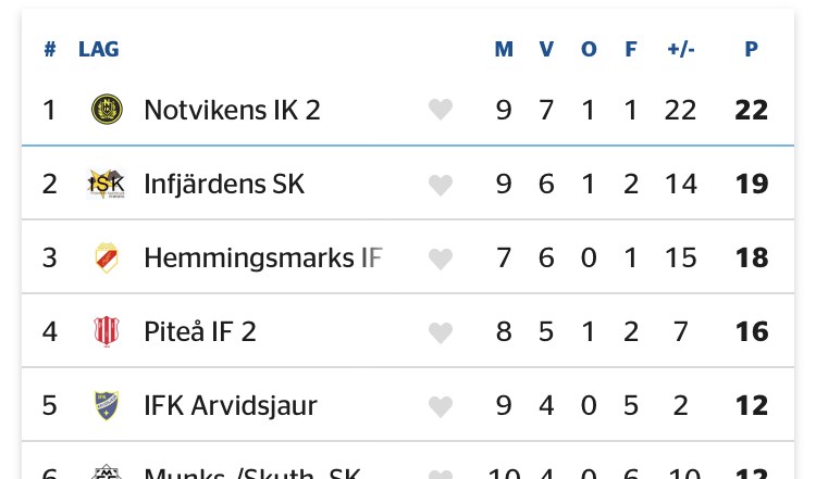 Nu gäller det att mentalt kunna ladda om för nya uppdrag. På torsdag är det seriefinal i fyran för lag 2 borta mot Hemmingsmarks IF. Detta om man tar hänsyn till hängmatcher i en haltande tabell och inte minst efter Infjärdens oväntade förlust mot Öjebyn. På nio omgångar har NIK 2 sju segrar, ett kryss och bara en förlust. Och förlusten kom mot just Hemmings. Med snabbt djupledsspel vände Hemmings den gången till seger med 3-1 trots att NIK hade ledningen. Nu är gulsvart förvarnade och åker med en bra trupp till Hifton. Truppen: Morgan G, Axel R, D Öhman, Alfred H, Emil L Svenne ES, V Skogfält, Victor P, Ante VH, Olle R, J Kåreborn, H Berlin, Nino T, Jocke S, Pierre B, Bangk K