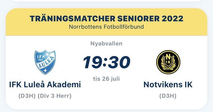 På lördag har du chansen att se Notasherrarna premiärspela på Tunavallens nya konstgräs. Piteå IF kommer på besök för semifinal i Stora Coop Norrbotten Cup (DM). Avspark 13.00. - - - Vi har redan kört igång med ett lotteri där du kan köpa lott/er med dragning i samband med matchen. Mer info nedan. - - - Lördagens gäster är denna säsong länets enda herrlag i div 1. Formen verkar god. Hela 6-2 hemma mot Vasalund i omstarten i onsdags. Semifinalplatsen säkrades genom 5-0 på Infjärden i kvarten. Notas fick en genomkörare i tisdags då man mötte IFK Luleå Akademi. Semifinalen har NIK nått genom att först vinna en grupp med Luleå SK och Infjärdens SK och sedan kvartsfinal mot Bodens BK (1-0). I potten ligger en finalplats mot IFK Luleå. IFK som vann sin semi borta mot Storfors AIK i onsdags. Laget Morgan G Felix R - Rasmus K - R Häggståhl - J Gylling R Lidhammar - V Skogfält - G Hamstig - Rasmus M Leon I - Neo V Bänken: Sven ES, Kevin F, Elias I, Lucas L, Rasmus N, D Öhman, Magnus J Hur Kan du stötta via lottköp? Swisha till 123 29 44 973. För 50 kr får Du en lott. För 100 kr får Du tre lotter. För 200 kr får Du sju lotter. Märk med "Sommar 50/50". Dragning sker på lördag 30/7 kl.13.45 i paus på matchen och vinnare kontaktas samt presenteras på sociala medier. Vinster: 1:a pris: 50% av intäkterna lottas ut till en vinnare. 2:a pris: Charklådan från Nordchark/Norrbottensgården. Notasherrarna tackar för Ert stöd på förhand! Entré Ordinarie: 60 kr Födda 2004 och senare: fri entré. Rapportering I appen Min Fotboll samt ev mål i Facebookgruppen "Notisen". Sponsorer vid match Nevo Maskin, Notab, Nordchark, Norrbottensgården, Lumire.