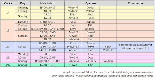 Caféet skall bemannas de dagar NSK har hemmamatch. Nedan finns schemat för vårterminen och P-10´s första vecka att bemanna kiosken är redan nästa vecka (V. 14). Fördelningen är inte millimeterrättvis men jag har gjort så gott jag kunnat.