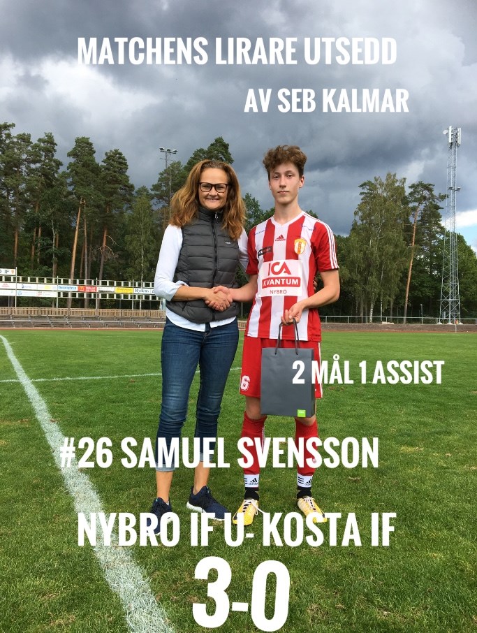 I dagens match mot Kosta IF så utsågs nr 26 Samuel Svensson till matchens lirare. Samuel stog för två mål och ett assist när Nybro IF U vann matchen rättvist med 3-0. Mycket bra spel och en fantastisk arbetsinsats idag killar. Nu jobbar vi stenhårt vidare i nästa vecka boys.
