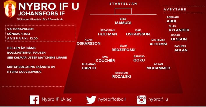 Nybro IF U ställer upp med följande laguppställning imorgon söndag kl 12.00. Välkomna gott folk till Vickan där det kommer bjudas på bra fotboll, grillat o bollkastning. Vad ställer Johansfors upp med?
