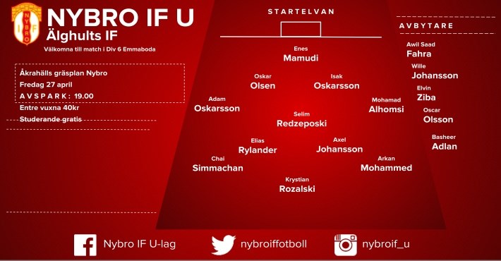Nybro IF-U vs Älghult Matchen börjar helt i NIF:s linje. Vi tar kontroll över bollen, etablerar spel och skapar efter två minuter en 2 vs 1 situation mot deras högerback. Efter lite trassel kommer vårt yrväder Chai ut med bollen och spelar till en helt fri Elias Rylander. Elias har en förmåga att lukta sig till målchanser på flera kilometer och blir helt ren framför mål. Bollen studsar till på en något ojämn plan och seglar över ribban. Vi fortsätter sedan att kontrollera spelet och gör 1-0 efter cirka 15 minuter genom yrvädret Chai som placerar in ett instick i djupled. Efter målet jämnar matchbilden ut sig. Älghult spelar mer aggressivt, använder sina välvuxna spelare på ett mer förtjänstfullt sätt och kvitterar till 1-1 i 20:e minuten. Resterande delen av halvleken är relativt jämn och fysisk. 1 – 1 står sig till paus. I andra halvlek plockar vi in lite mer fysik centralt för att hantera deras nummer 12 som är väldigt involverad i spelet. Vi har bekymmer de första 10 minuterna, Älghult skapar en bra nick och ett halvfriläge från dålig vinkel. Efter det tar vi kommandot och äter oss in i matchen mer och mer. I 65:e minuten kommer en djupledsboll centralt som touchar en av deras mittbackar, vilket gör att det offsidestående polska stålet Krystian Rozalski blir helt friställd, löper ifrån och placerar in 2-1. Efter ledningsmålet vill vi hålla dem på utsidan och kontra sönder dem. Vi lyckas vaska fram några heta chanser, framförallt en nick från Awil ”Fader” Farah som smiter precis utanför. Resten av halvleken blir böljande fram och tillbaka, men vi håller dem på utsidan. I 87:e minuten bryter de sig fram på kanten och hittar ett inspel på bortre stolpen, kvitteringen är ett faktum och står sig matchen ut. Besvikelsen var enorm och första trepoängaren för våra unga grabbar var otroligt nära. Hela laget ska ha stort beröm för arbetsinsatsen, vi jobbar stenhårt för varandra och det ska vi ta med oss. Nästa match spelas på fredag borta mot Flerohopp kl. 19. Ses där! Forza NIF-U!