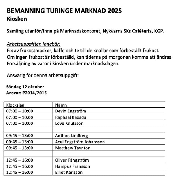 Kan man inte den tilldelade tiden så får ni byta med varandra eller någon annan i laget (ej via lagledare/tränare) - ni ska se till att någon är på plats under den tilldelade tiden - måste få ett OK på att någon tagit eran tid om ni inte kan, räcker inte med att skriva en kommentar. Ev ändringar meddelas till lagledare så infon kan uppdateras då kansliet vill ha kontaktuppgifter till de som ska vara i kiosken.