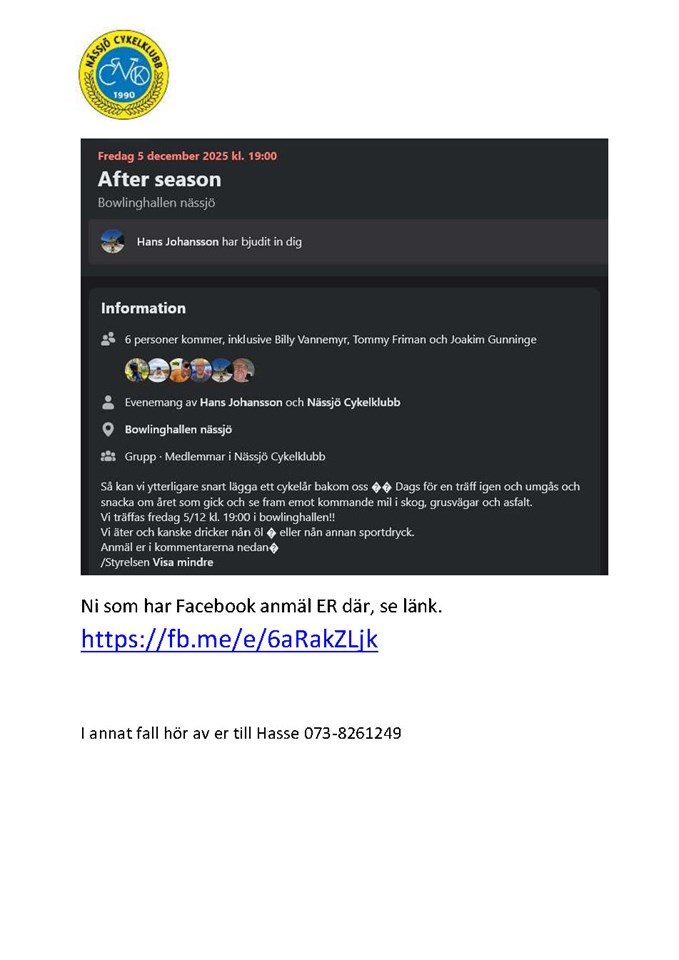 Klicka på bekräftelselänken i det mejl vi skickat dig för att börja ta emot uppdateringar från Nässjö Cykelklubb.