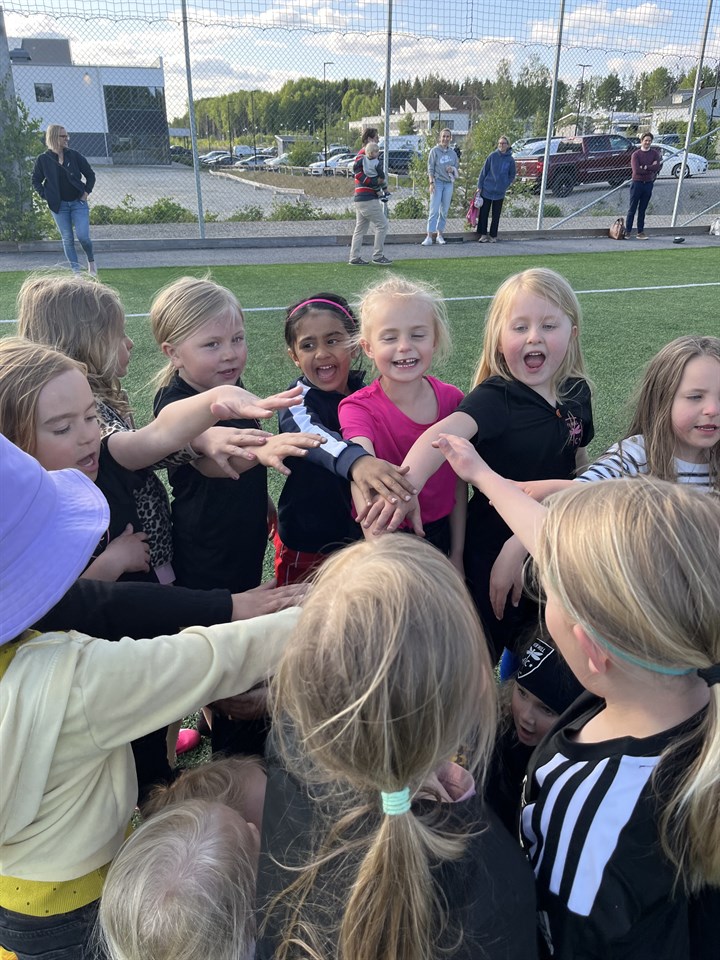 Wow, vilken dag vi fick i Gnesta! Tjejernas första sammandrag och första matchen någonsin - historia skrevs och som de gjorde det! Tuffa, coola och full fart framåt! Trots att motståndarna ibland var något eller ett par huvuden längre och större så fanns det inga tveksamheter vart bollen skulle. Tjejerna visade att det vi lärt oss på träningen gett resultat och tillsammans med massa skratt, hjulningar och dans lyckades de genomföra alla 6 matcher med bravur och ställde t om upp på en extramatch. Så efter totalt 7 matcher, uppdelat på två lag, så kunde vi åka hem från en härlig dag tillsammans med humöret på topp. Tror det var många som somnade gott den kvällen:) Tusen tack till alla föräldrar som peppade och stöttade lagen under dagen - ni är verkligen världens bästa supportrar! Extra stort tack till Emma, Richard, Andreas och Jens så som ställde upp som coacher under dagen. Ni var grymma med tjejerna, peppade, busade och uppmuntrade dem till att vara modiga och spela med glädje! Nästa sammandrag är den 3 september och jag har efterfrågat mer kring spelplats och tider, återkommer när jag fått besked. Anmälan är öppen:) Allt gott!/Anki