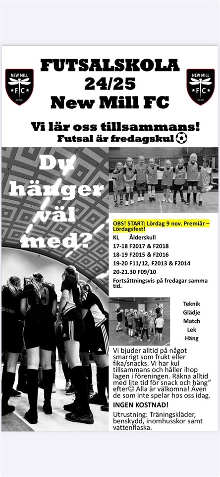 Hej, På lördag den 9 nov kl.17-18 i Turinge hallen är det premiär för vår Futsalskola med Anki & David! Futsalskolan är sedan varje fredag kl. 17-18 i Turingehallen. Info ligger även upplagt i kalender på laget.se Ofta kommer någon/några F2018 ledare vara på plats men inte alltid. Hoppas vi ses och att ni kan vara med!