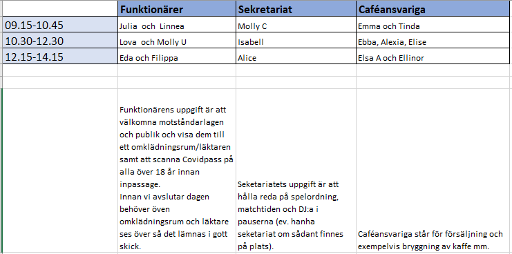 Hej! Lucia Futsal Cupen är nära och vi behöver er hjälp att styra upp denna dag på bästa sätt. Det innebär att ni behöver hjälpa till med följande uppdrag: funktionärer, caféansvariga och sekretariat. i bifogad fil ser ni vad ni blivit tilldelade. Om man inte kan genomföra sitt pass just den tiden så ber vi er att lösa det mellan er föräldrar i första hand. För er som är funktionärer; Vaccinationspass kommer krävas för alla över 18 år för att komma in. Ni kan ladda ned appen för att kunna scanna av vaccinationspassen på: www.covidbevis.se Ni kommer få mer information om uppdragen när ni är på plats Lördagen den 11/12. Väl mött. /Ledarna