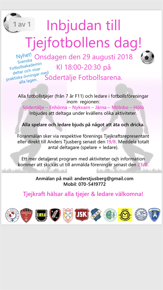 Hej! Tack för ett härligt sammandrag i söndags och för ert engagemang! Vi tränare hade superkul och så även tjejerna! På onsdag 29/8 är det tjejfotbollens dag i Södertälje. Denna hålls kvällstid, 18-20.30 och det bjuds på mat för de spelare som är anmälda. Tyvärr har denna inbjudan inte nått oss förrän nu, men vi får komma in med en sen anmälan om intresse finns, därför vill vi kolla hur intresset för detta ser ut. Är intresset för litet avvaktar vi tills nästa år då vi förhoppningsvis får inbjudan i tid. Läs inbjudan och kommentera i detta inlägg om ditt barn kan/vill komma. Det är helt frivilligt och en kul grej för tjejerna att träffa andra tjejer som spelar fotboll och ha roligt!