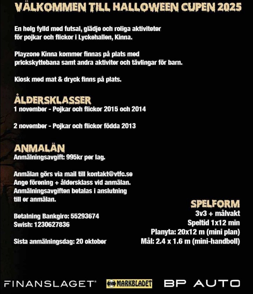 Hej, Västra Together arrangerar en futsalcup för barn med halloween-tema. Förutom matcher kommer det att finnas många roliga aktiviteter på plats. Om er förening vill anmäla ett eller flera lag blir vi väldigt glada. Bifogat finns två bilder med mer information. Välkomna med er anmälan! / Västra Together
