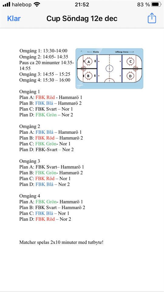Här kommer spelschemat till söndagens poolspel. Matcherna är 2x10 min och varje lag spelar fyra matcher var. Vi deltar med två lag och vi möter FBK & HHC Team 13. Samling vid Löfbergs Arena kl 12.15. Poolspelet pågår från 13.15-16.05.