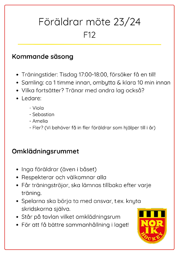 Här kommer lite info från föräldrar mötet för dem som inte var med, vi kommer förmodligen ha ett till lite längre fram som vi hoppas fler kommer vara med på! Denna säsong kommer vi på ledarsidan behöva med stöd och hjälp från er föräldrar både på isen och utanför, är ni intresserade så kan ni kontakta oss eller prata med någon utav ledarna vid träningarna.