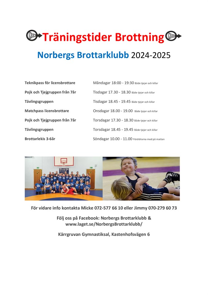 Hej Brottarvänner! Vi strukturerar om träningstiderna något. Lilla tjejträningen på Måndagar flyttas och slås istället ihop med Lilla killträningen på Tisdagar 17.30 (Samma upplägg som på Torsdagar) Matchpasset börjar igen 9/9 öppet för alla med licens. Teknikpasset för tävlingsbrottare på Måndagar startar nu 18.00 och slutar 19.30. Vi startar med detta nästa vecka 2/9 / Tränarna NBK Norbergs Brottarklubb 28 aug 2024 0kommentarer