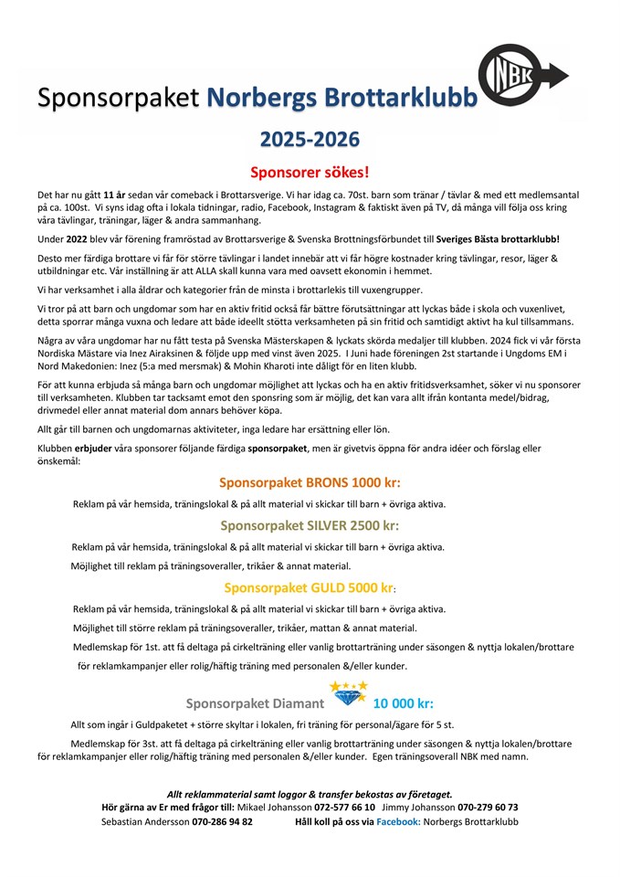 Sponsorer sökes! Det har nu gått 11 år sedan vår comeback i Brottarsverige. Vi har idag ca. 70st. barn som tränar / tävlar & med ett medlemsantal på ca. 100st. Vi syns idag ofta i lokala tidningar, radio, Facebook, Instagram & faktiskt även på TV, då många vill följa oss kring våra tävlingar, träningar, läger & andra sammanhang. Under 2022 blev vår förening framröstad av Brottarsverige & Svenska Brottningsförbundet till Sveriges Bästa brottarklubb! Desto mer färdiga brottare vi får för större tävlingar i landet innebär att vi får högre kostnader kring tävlingar, resor, läger & utbildningar etc. Vår inställning är att ALLA skall kunna vara med oavsett ekonomin i hemmet. Vi har verksamhet i alla åldrar och kategorier från de minsta i brottarlekis till vuxengrupper. Vi tror på att barn och ungdomar som har en aktiv fritid också får bättre förutsättningar att lyckas både i skola och vuxenlivet, detta sporrar många vuxna och ledare att både ideellt stötta verksamheten på sin fritid och samtidigt aktivt ha kul tillsammans. Några av våra ungdomar har nu fått testa på Svenska Mästerskapen & lyckats skörda medaljer till klubben. 2024 fick vi vår första Nordiska Mästare via Inez Airaksinen & följde upp med vinst även 2025. I Juni hade föreningen 2st startande i Ungdoms EM i Nord Makedonien: Inez (5:a med mersmak) & Mohin Kharoti inte dåligt för en liten klubb. För att kunna erbjuda så många barn och ungdomar möjlighet att lyckas och ha en aktiv fritidsverksamhet, söker vi nu sponsorer till verksamheten. Klubben tar tacksamt emot den sponsring som är möjlig, det kan vara allt ifrån kontanta medel/bidrag, drivmedel eller annat material dom annars behöver köpa. Allt går till barnen och ungdomarnas aktiviteter, inga ledare har ersättning eller lön. Klubben erbjuder våra sponsorer följande färdiga sponsorpaket, men är givetvis öppna för andra idéer och förslag eller önskemål: Sponsorpaket BRONS 1000 kr: Reklam på vår hemsida, träningslokal & på allt material vi skickar till barn + övriga aktiva. Sponsorpaket SILVER 2500 kr: Reklam på vår hemsida, träningslokal & på allt material vi skickar till barn + övriga aktiva. Möjlighet till reklam på träningsoveraller, trikåer & annat material. Sponsorpaket GULD 5000 kr: Reklam på vår hemsida, träningslokal & på allt material vi skickar till barn + övriga aktiva. Möjlighet till större reklam på träningsoveraller, trikåer, mattan & annat material. Medlemskap för 1st. att få deltaga på cirkelträning eller vanlig brottarträning under säsongen & nyttja lokalen/brottare för reklamkampanjer eller rolig/häftig träning med personalen &/eller kunder. Sponsorpaket Diamant 10 000 kr: Allt som ingår i Guldpaketet + större skyltar i lokalen, fri träning för personal/ägare för 5 st. Medlemskap för 3st. att få deltaga på cirkelträning eller vanlig brottarträning under säsongen & nyttja lokalen/brottare för reklamkampanjer eller rolig/häftig träning med personalen &/eller kunder. Egen träningsoverall NBK med namn. Allt reklammaterial samt loggor & transfer bekostas av företaget. Hör gärna av Er med frågor till: Mikael Johansson 072-577 66 10 Jimmy Johansson 070-279 60 73 Sebastian Andersson 070-286 94 82 Håll koll på oss via Facebook: Klicka här för att komma till NBKs Facebooksida
