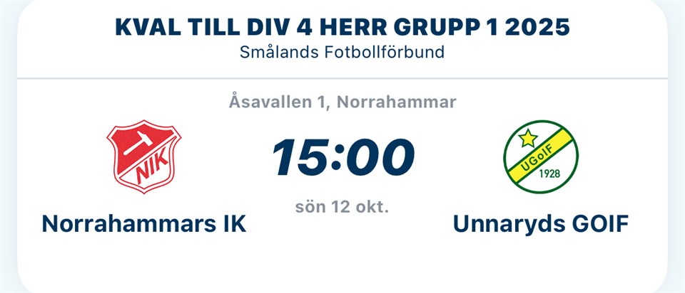 Herrlag Unnaryds GoIF (hemma) | 12 okt, 15:00 |