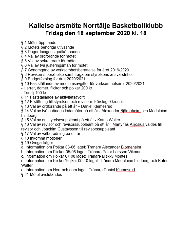 Norrtälje Basket årsmöte Datum: Fridag den 18 september 2020 Plats: Norrtälje Sportcentrum Tid: kl 18 Vi har bokat ett stort konferensrum för att hålla avstånd. Om du vill delta digitalt måste du mejla oss minst fem dagar före mötet för att fixa tekniken. Daniel Klemesrud Ordförande Norrtälje Basketbollklubb